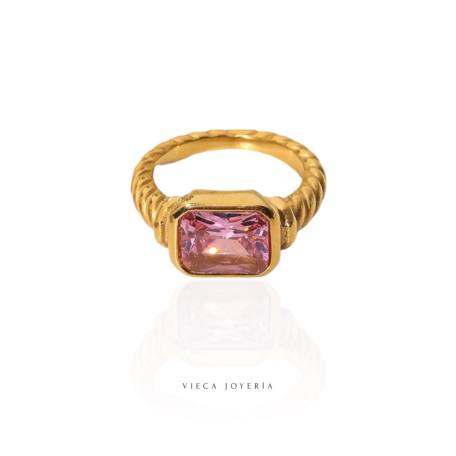 Anillo dorado con piedra rosa y traslucida: delicado y lleno de estilo. Todas nuestras piezas son resistentes al agua, a prueba de sudor y ducha. ¡Llévalo 24/7 sin preocupaciones!